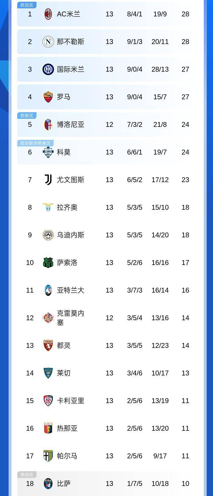 这一结果直接导致积分榜形势大乱,呈现出前所未有的胶着态势:那不勒斯与AC米兰同积28分,并驾齐驱,占据榜首位置;国际米兰和罗马则以27分紧随其后,构成第一集团。令人惊叹的是,前四名球队之间竟然只有区区一分之差!这哪里是足球联赛,简直就是一出扣人心弦的悬疑剧!